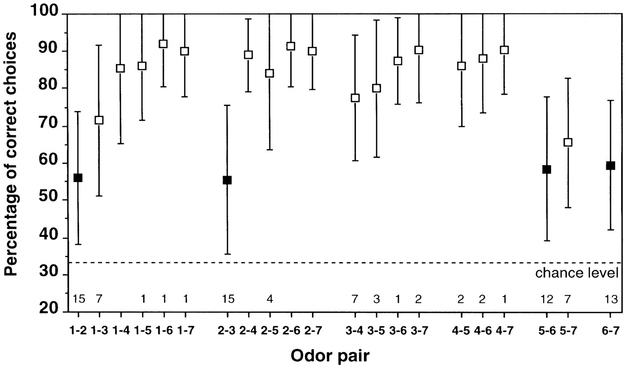 Performance of 20 subjects in discriminating between members of a homologous series of aliphatic aldehydes. Each data point represents the percentage (means ± SD) of correct choices from 10 decisions per odor pair and subject. Filled symbols indicate odor pairs that were not discriminated above chance at the group level. The figures above the abscissa indicate the number of subjects that failed to perform above chance in the corresponding task. 1. n-butanal; 2. n-pentanal; 3. n-hexanal; 4. n-heptanal; 5. n-octanal; 6. n-nonanal; 7. n-decanal.