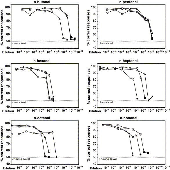 Performance of CD-1 mice in discriminating between various dilutions of an aliphatic n-aldehyde and the odorless solvent mineral oil. Each data point represents the percentage of correct choices from a total of 100 decisions per individual animal. The three different symbols represent data from each of the three individual animals tested per odorant. With C4-C8, preexposed animals are indicated by a circle and a square, respectively, and the non-preexposed animal is indicated by a triangle. Filled symbols indicate dilutions that were not discriminated significantly above chance level (binomial test, p > 0.05).